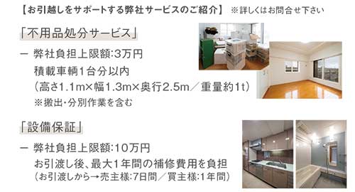 - お引越しやお住み替えにもうれしい「不用品処分サービス」、お引渡し日から売主様・買主様双方への保証費用をサポートする「設備保証サービス」もご用意。