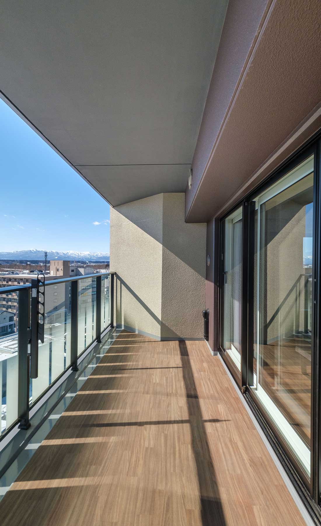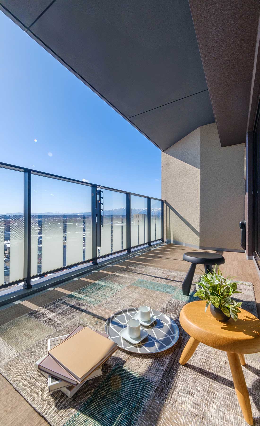 プロカメラマン撮影時やお客様ご案内時に、バルコニーをコーディネートいたしました。弊社は新築マンションの企画・販売も行ってきたため、家具や小物を豊富に所有しております。