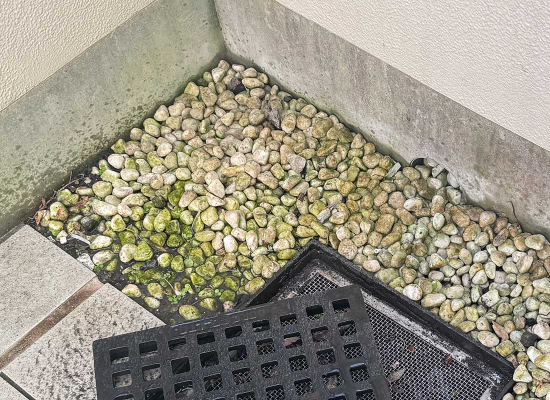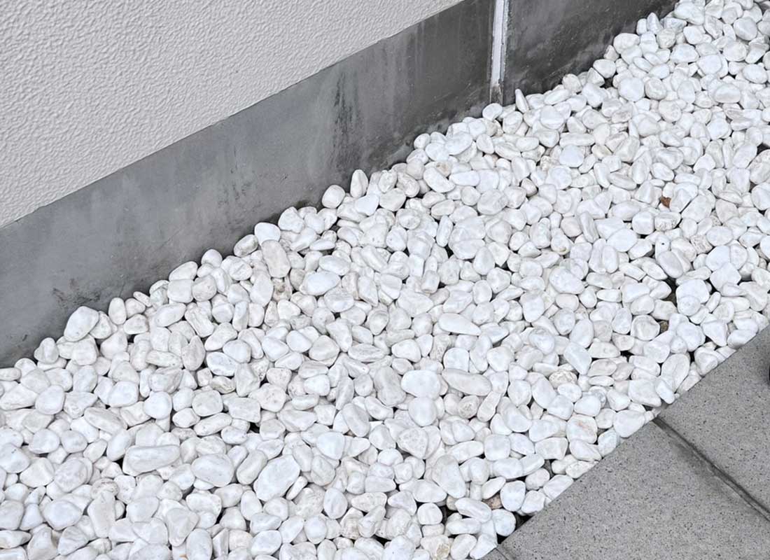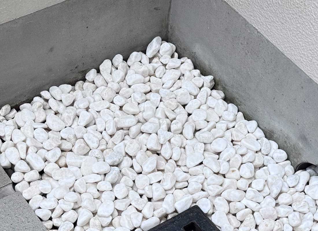 今回のお部屋は専用庭&専用テラスがあり、一部に白玉砂利が敷かれていました。年数がたってくるとどうしても汚れで黒みがかる白玉砂利。キレイに洗浄し、お引渡し当日を迎えることができました。