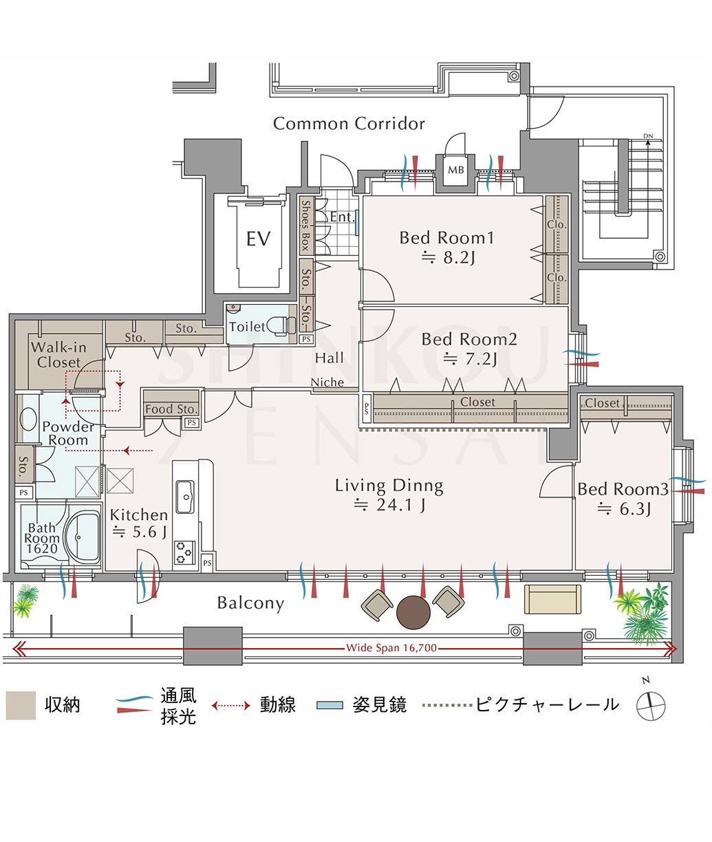 - 三面採光と南面に約16mのワイドスパンを実現