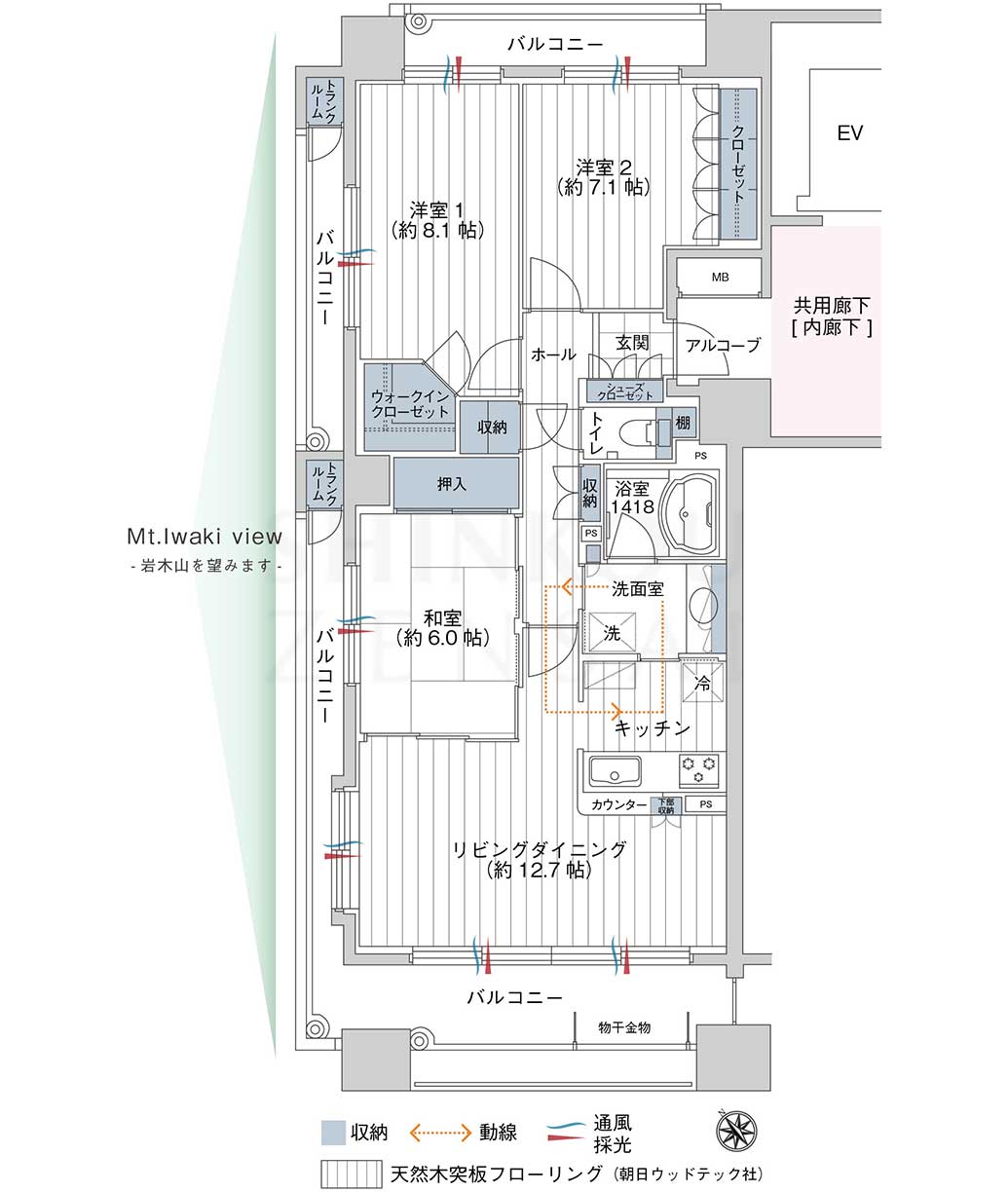 - 三面をバルコニーに囲まれており、西面方向に岩木山を望みます