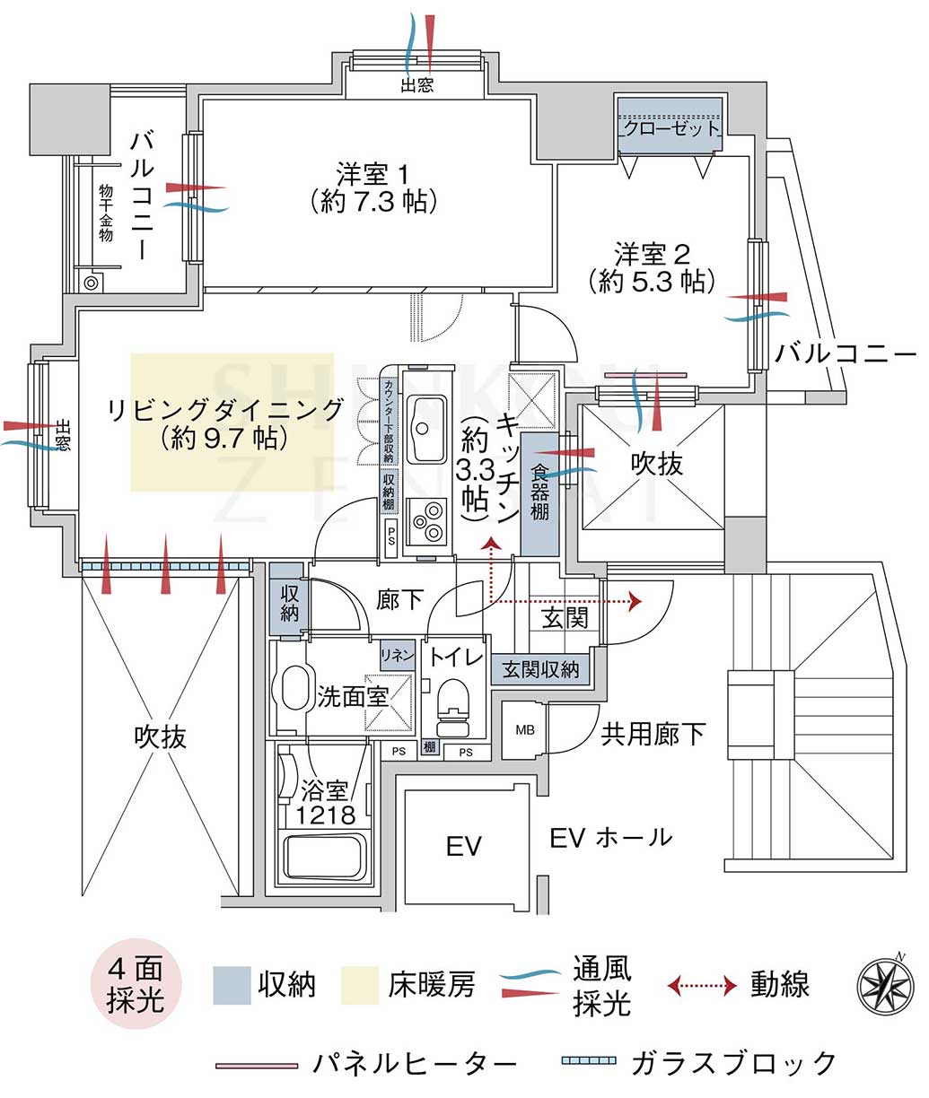 - マンションでは珍しい四面開口部を設けた通風採光の良いプラン