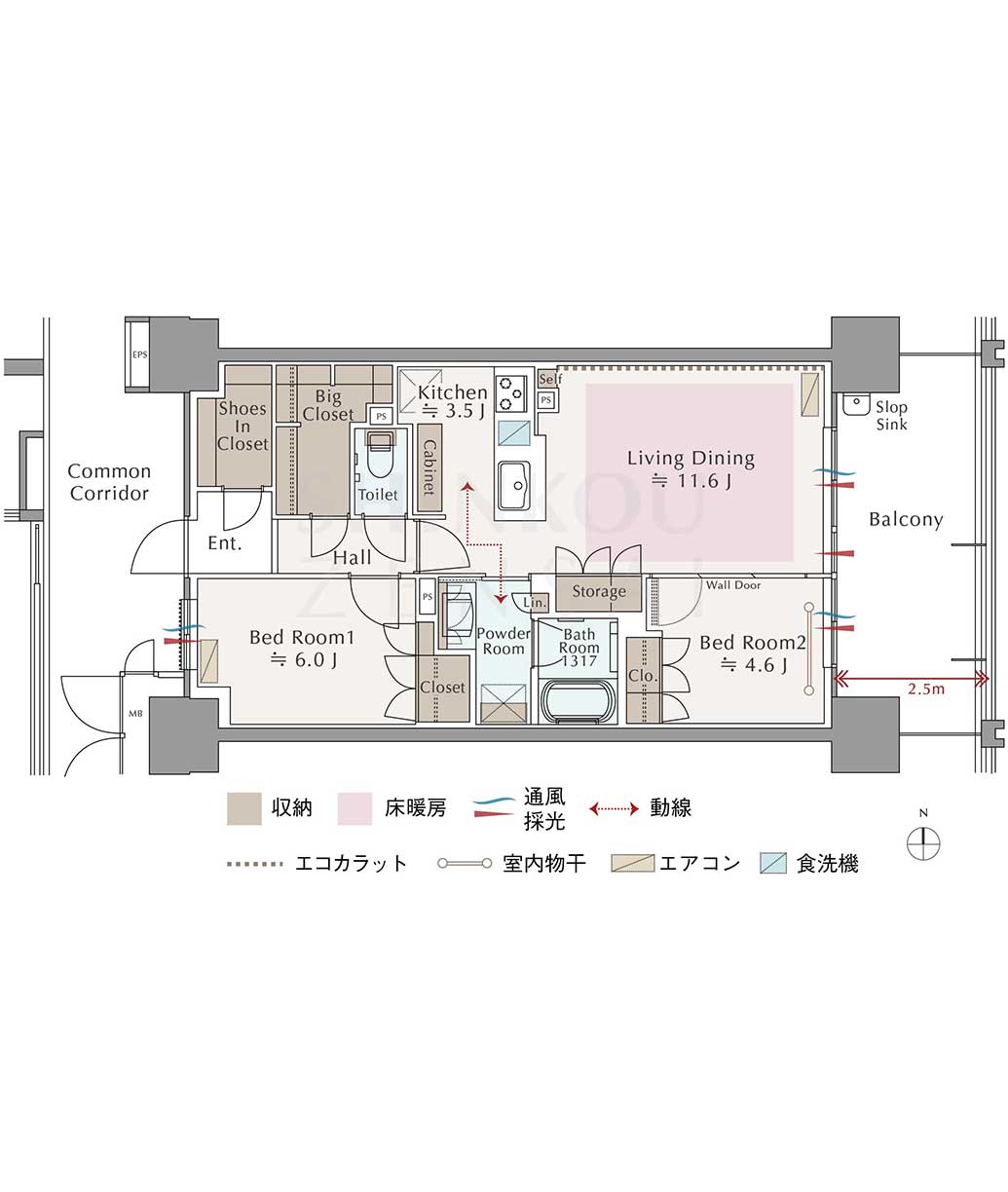 - 大型シューズインクロークとビッグクローゼットを備えた収納力のあるプラン
