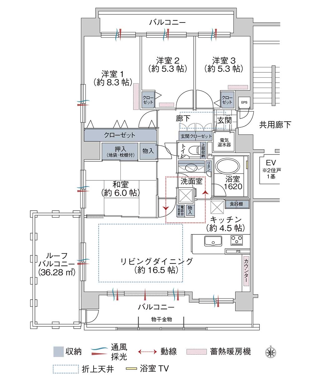 | 間取内訳 | 4LDK|和 6 洋 8.3・5.3・5.3 LDK 20.7 ※ルーフバルコニー:36.28㎡ |