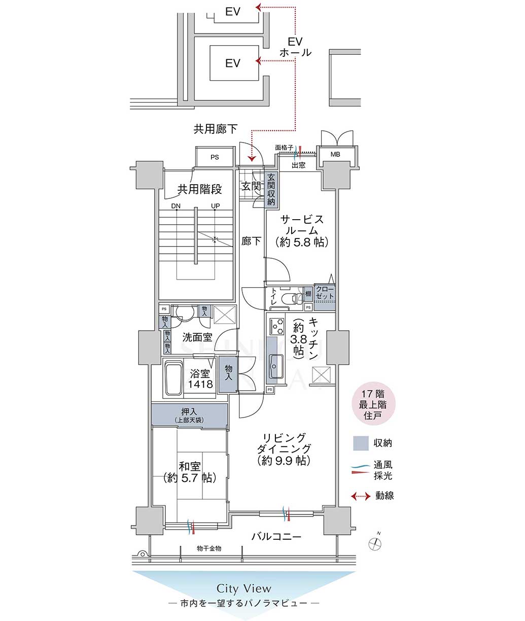 - 市内を一望する圧巻のパノラマビューが魅力の最上階17階・南向き1LDK+サービスルーム