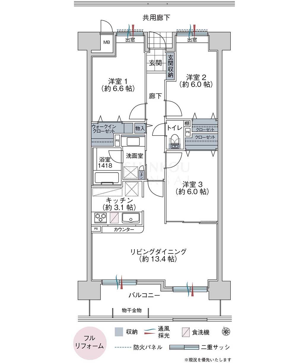 | 間取内訳 | 3LDK(洋 6.6・6・6 LDK 16.4) |