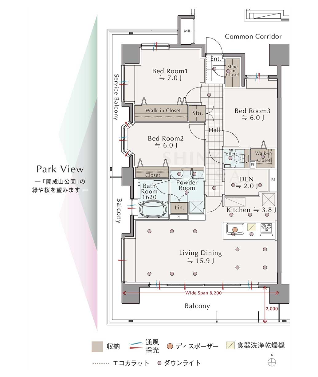 - 開放的な三面バルコニー付きの高層階11階・南西角住戸3LDK+書斎スペース(約2.0帖)