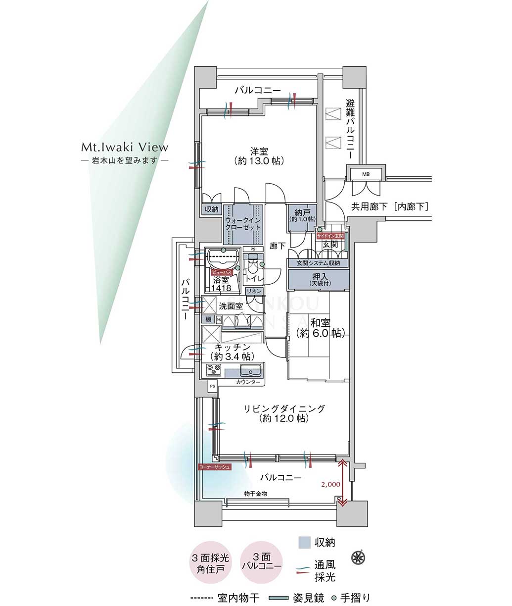 - 開放的な三面バルコニー。約13帖ゆとりの主寝室からは雄大な岩木山を望みます