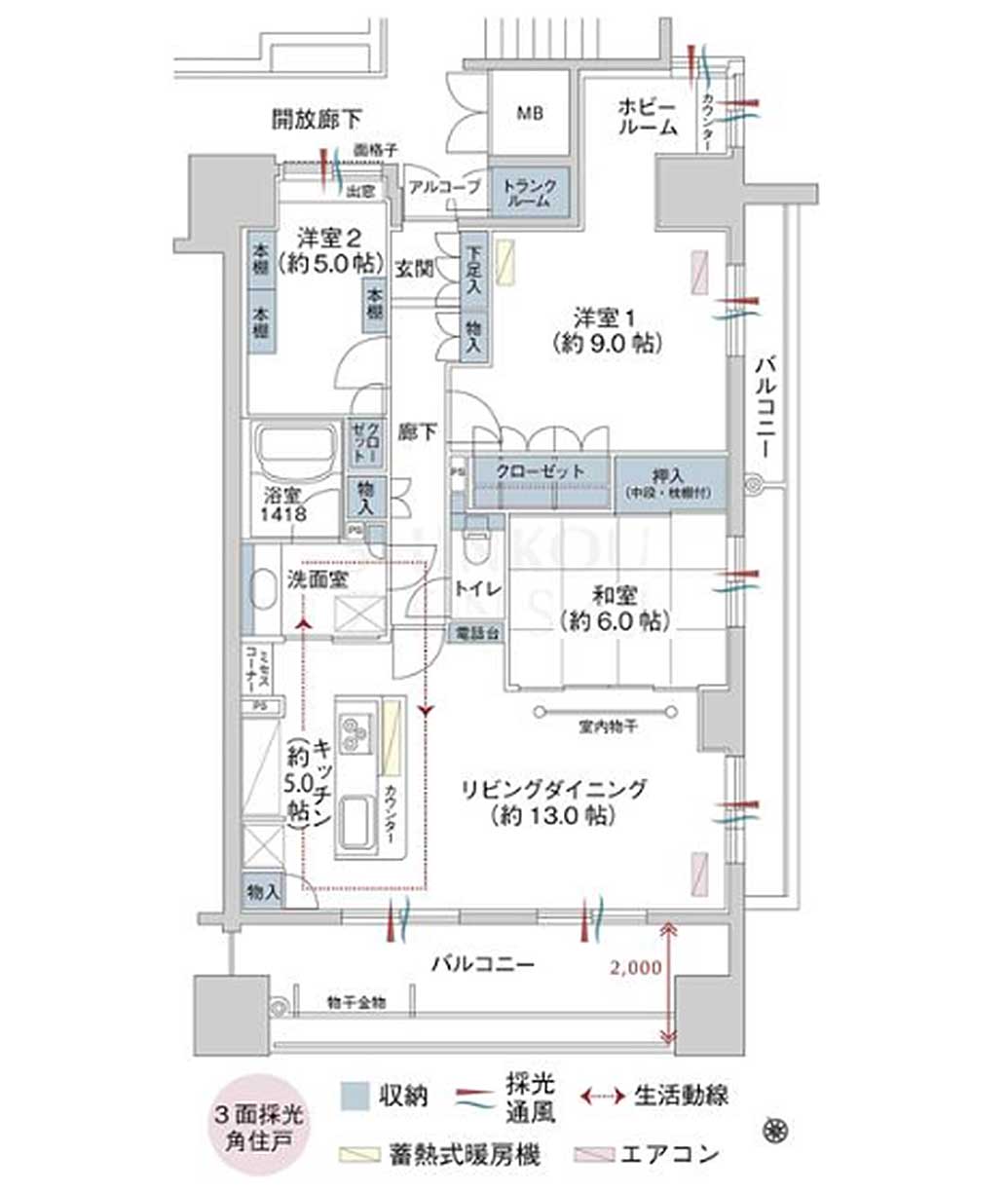 - 7階・二面バルコニー付きの南東角住戸・90㎡超3LDK