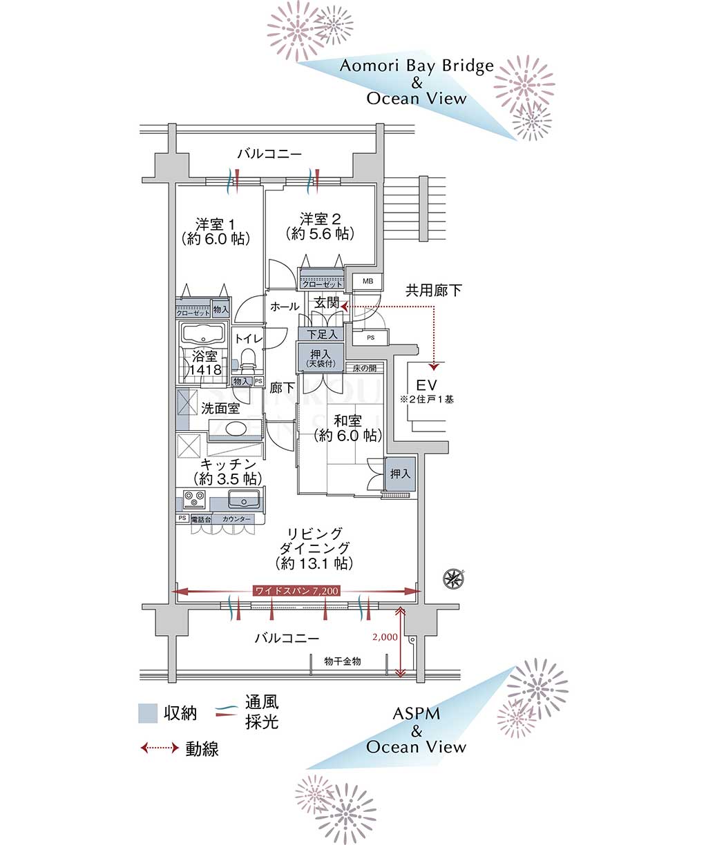 - 青森港やベイブリッジ、アスパムを望む開放的な二面バルコニー