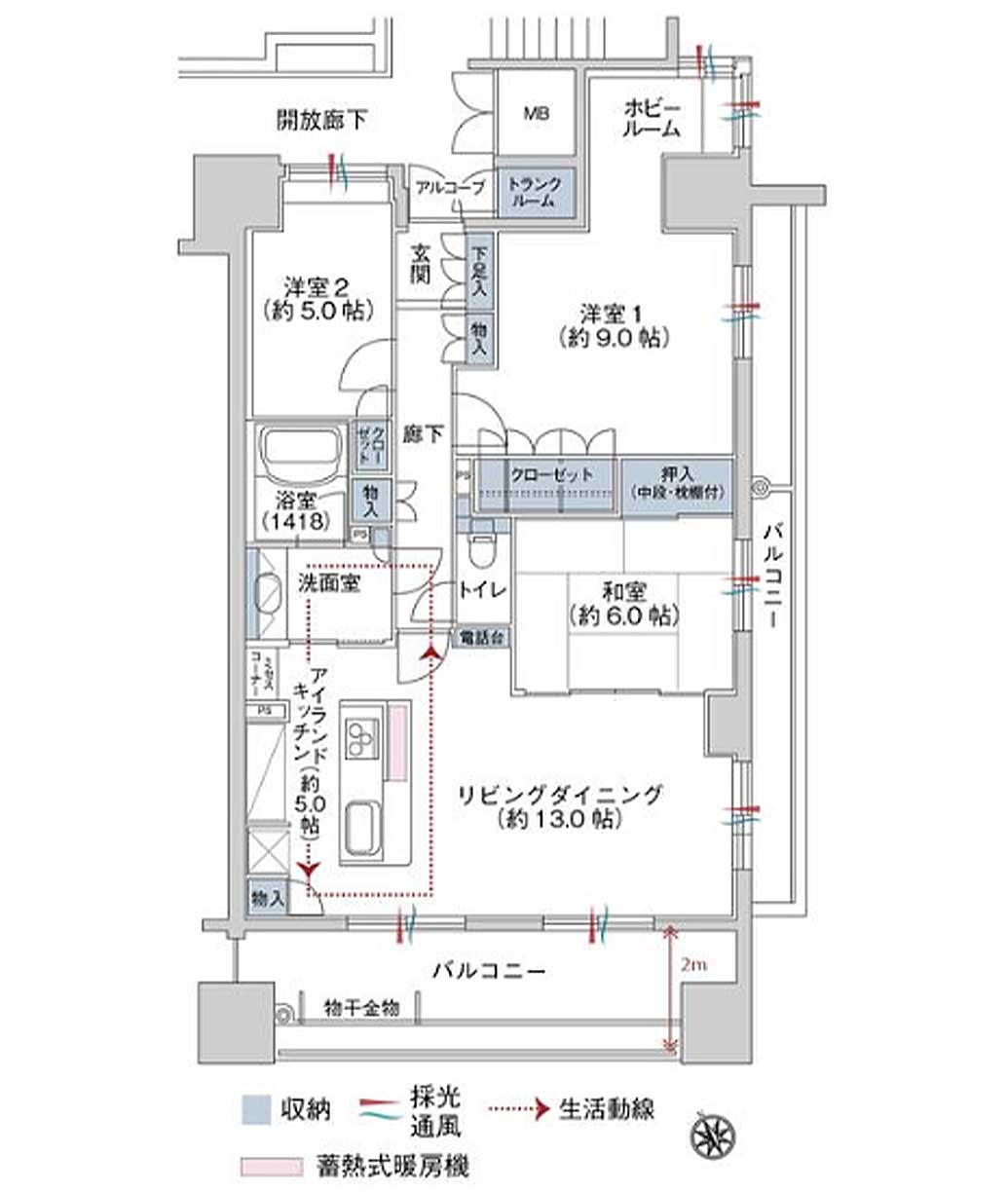 - 開放的な二面バルコニー付きの南東角住戸