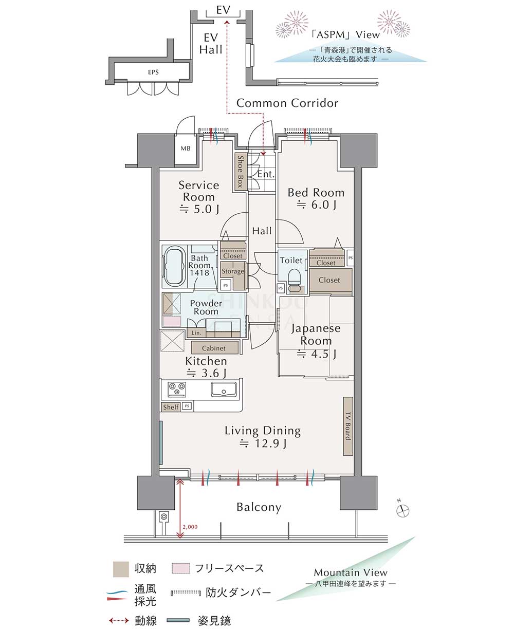 - 高層階11階・南向き2LDK+サービスルーム(約5帖)