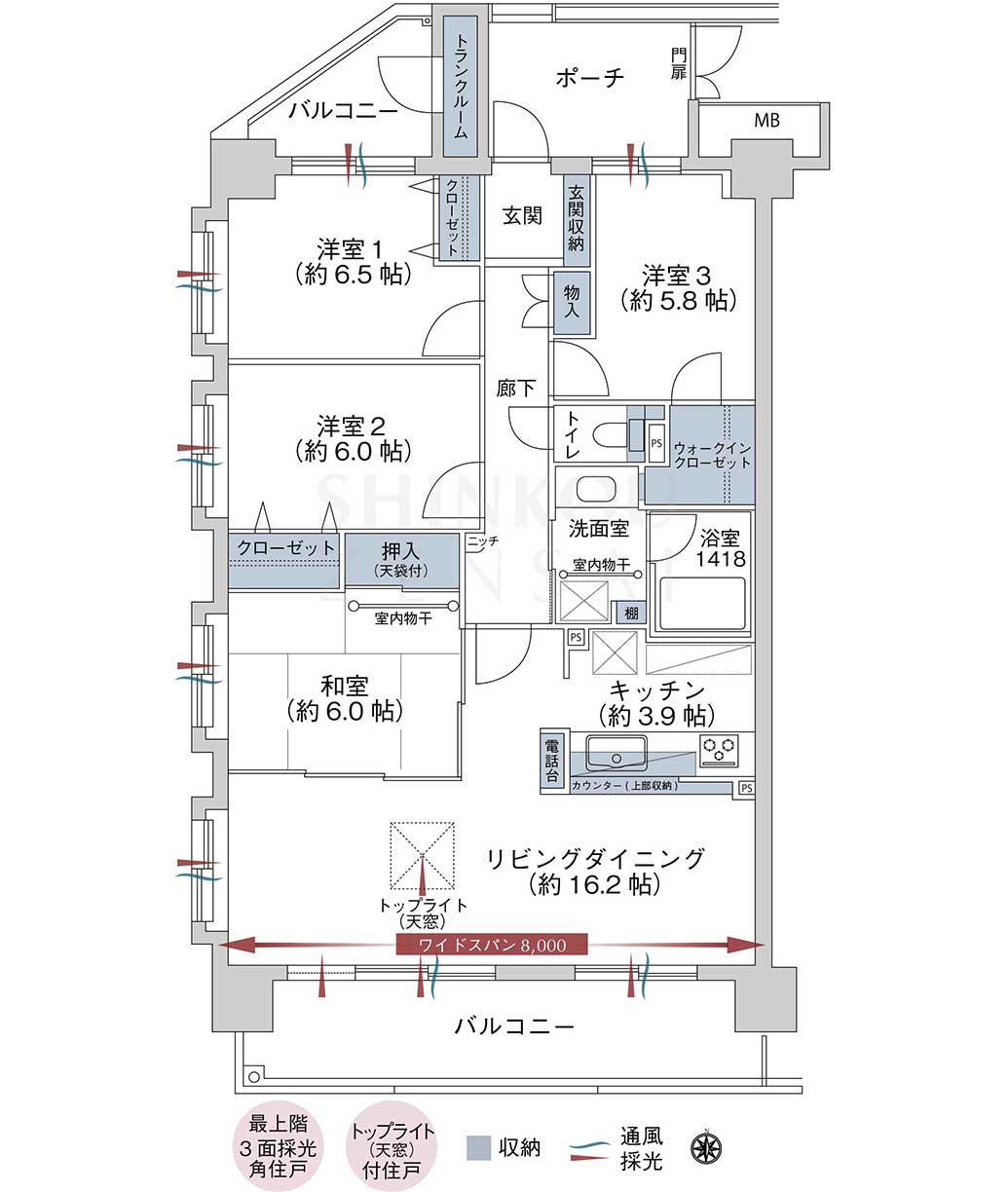 - 三面採光やトップライト(天窓)があり、明るいお部屋です