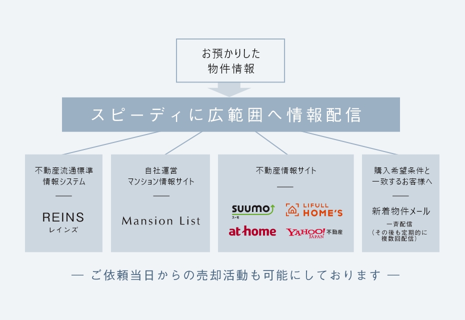 人気・大手不動産情報サイト4社へ、最短で販売開始日に即日掲載します。質の高い情報をより多くの方々へ、いち早く配信。