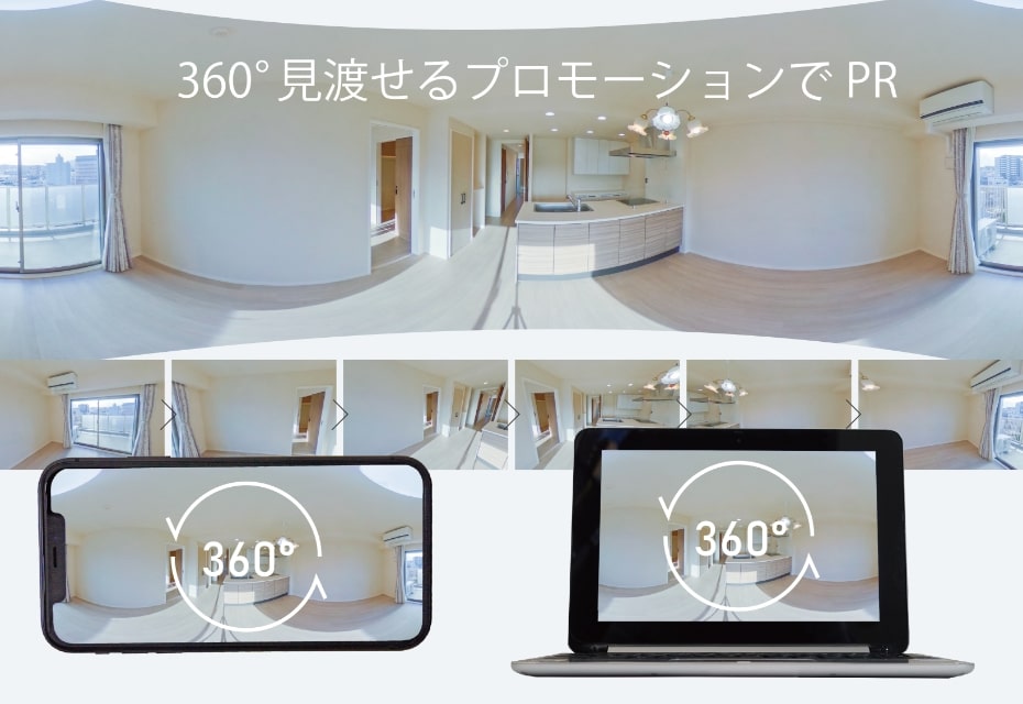 360度カメラを使って撮影することで、物件を様々な角度からPRします(無償)。実際に内覧しているかのようにバーチャルで室内を自由に移動でき、すぐに内覧できない遠方のお客様にも情報を届けられます。